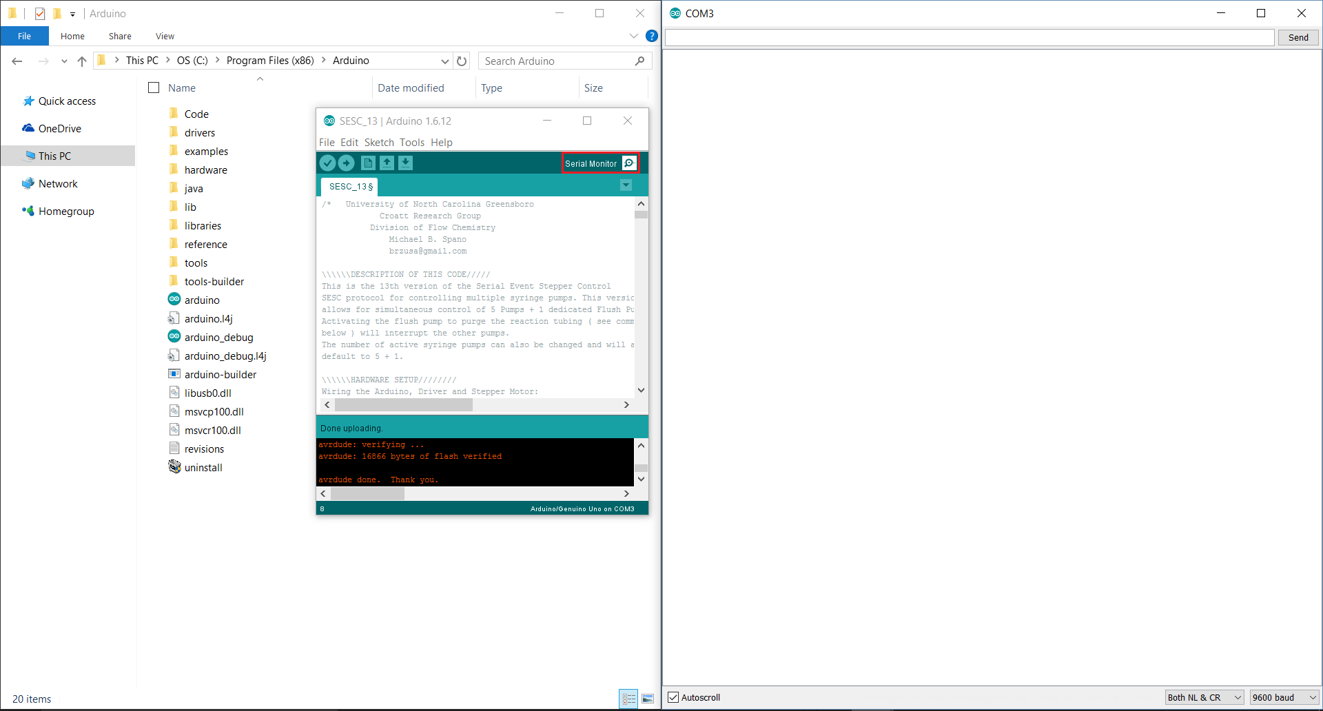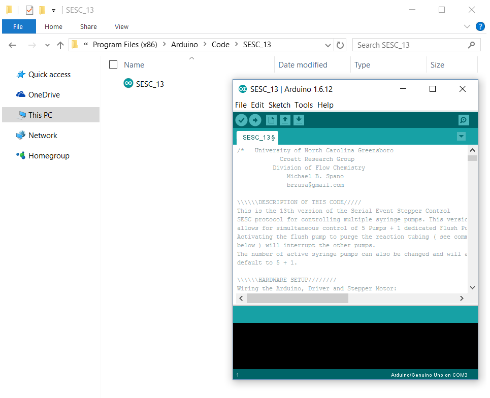- Create folder to contain code file; save the code to folder and open SESC_13 file through the Arduino IDE (Arduino OS > Program Files (x86) > Arduino > Code > SESC_13)