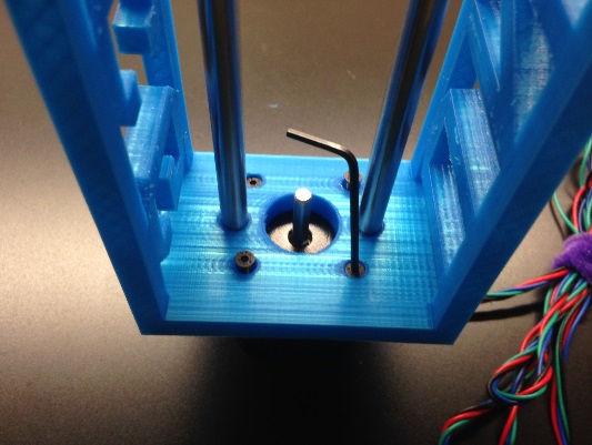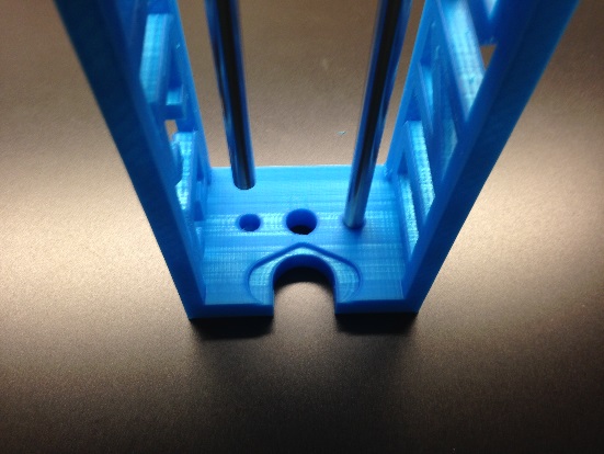 The smooth support rods are pushed through the two side holes next to the large hole in the chassis. The smooth rods are then fed through the ball bearing bushings assembled in the previous step. Assure that the pushing block is pointing towards the opening in the chassis where the syringe will be placed before pushing the support rods completely in. The fit is snug and should be flush when placing the motor on the chassis.
