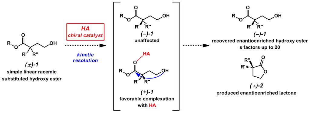 Current efforts have been directed toward an efficient synthesis of enantioenriched a-substituted hydroxy esters via a kinetic resolution event is described.  Bulky racemic esters in the presence of a chiral Brønsted acid selectively lactonize to yield a recoverable en-antioenriched hydroxy ester and lactone.  These esters are highly versatile building blocks that can readily be converted to synthetically useful materials.