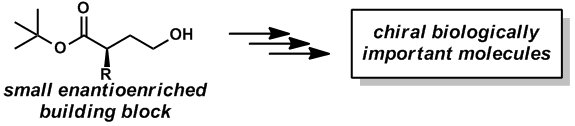 Many biologically important compounds contain a chiral center who’s absolute configuration is critical for activity. Compounds found in nature that are identified with prospective utility in human health frequently exist as a complex mixture and are produced in such small quantities that they cannot be fully vetted for their potential.  The exploration and future use of these precious materials often is contingent on the ability of a synthetic chemist to prepare them in an efficient and selective manner.  Key to success of a laboratory synthesis of an enantioenriched complex molecule is the availability of simple enantioenriched building blocks.  The ideal building block would have handles that are readily transformed into a variety of functionalities that can be incorporated into the biologically important molecule.   A major focus of our research laboratory is the development of asymmetric methodologies for the synthesis of versatile enantioenriched building blocks.